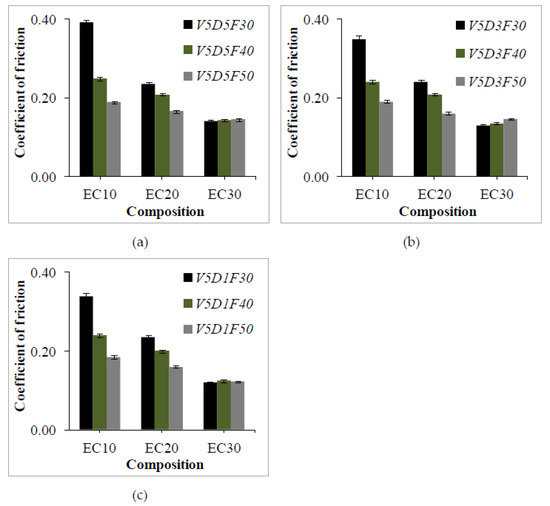The observed for different loading conditions is shown in Figure 7.It can be seen that shows a decreasing trend with an increase in crump rubber content. Higher filler loadings result in minimal variations at the interface between the pin (sample) and the rotary disc. Thus, lower surface roughness values are seen and, consequently, decreases. varies from 0.12 to 0.39 for all of the test conditions. Furthermore, it should be noted that values show significant reduction at higher applied loads (50 N), as supported by the mathematical modelling results. The optimal parameters recorded for a minimum level of coefficient of friction in PCA analysis are a higher level of crump rubber content (30%), medium level of sliding distance (3 m/s), and a higher level of normal load (50 N). An increase in contact between the sample and the disc leads to effective compression of asperities on the disc, and results in the formation of a lubricating film. Therefore, is considerably reduced at higher loads with more crump rubber content, and the same is reflected in the wear of the samples.