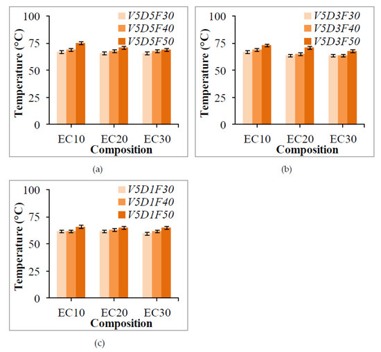 The temperature of the disc recorded after each test for different crump rubber loadings and test conditions is reported in Figure 8. For all of the specimens, disc temperature increased with an increase in applied load, attributed to higher frictional forces and high adiabatic heating at the interface of the disc and the specimen. The increase in disc temperature is a strong function of applied load and sliding velocity. Nevertheless, it can be seen that disc temperatures recorded with increasing filler loadings show decreasing trends. These trends are attributed to the ability of crump rubber particles to effectively absorb the heat during sliding wear. Thermogravimetric analysis curves reported in [42] reveal that all crump rubber–epoxy composites reveal a one-step degradation mechanism, and onset of degradation for EC-10, EC-20, and EC-30 takes place at 359, 362, and 365 °C, respectively. Furthermore, we also found that EC-30 registers a higher final degradation temperature, and char residue left at 700 °C is also higher compared to lower filler loadings, indicating higher thermal stability. Furthermore, we also predict that low undulations of the pin on the disc with higher filler content will restrict the rise in temperature. Although temperature plays a significant role in dry sliding wear scenarios, the present study demonstrates that reinforcement with crump rubber restricts the rise in temperature to a significant degree. Differential scanning calorimetry tests confirm that the glass transition temperature of EC-10, EC-20, and EC-30 composites is 85, 89, and 101–105 °C, respectively. Furthermore, wider curing curves are seen with crump rubber composites, depicting complete polymerization of composites by releasing more heat during curing. Therefore, it can be concluded that crump rubber–epoxy composites can be considered to be best suited for dry sliding wear scenarios, given their excellent ability to resist sliding wear, even under elevated-temperature environments, owing to their high thermal stability.