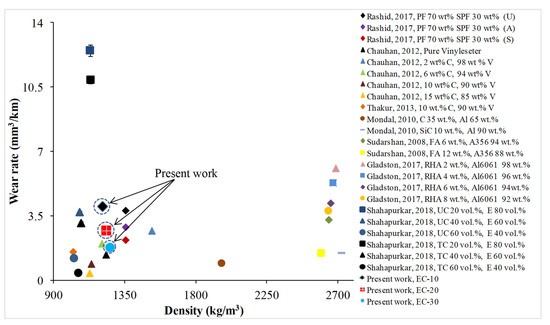 Quantifying the observed results with available studies in the form of a property map acts as a guideline for researchers and industries in selecting a specific configuration based on the envisaged applications. Wear rate results recorded at a velocity of 5 m/s and an applied load of 50 N are compared with the extracted data from the literature and are plotted against density in Figure 11 [12,47,48,49,50,51]. Data extracted from metal matrix composites are also mapped in Figure 11 to show the effectiveness of the present work. It can be seen that polymer matrix composites show lower wear rates and density compared to metal matrix composites. However, comparing the present study’s results with fly ash, rice husk ash, cenosphere-based epoxy, and vinyl ester composites shows intermediate values. Nevertheless, the advantages of reinforcement with waste and non-disposable crump rubber in dry sliding wear scenarios are clearly evident from Figure 11. EC-30 reveals the lowest wear rate from the present study and can be considered to be best suited for wear applications. Crump rubber is abundantly available throughout the world and can be effectively used to fabricate composites for wear-resistant applications and minimize the landfill burden and concerned disposal issues.