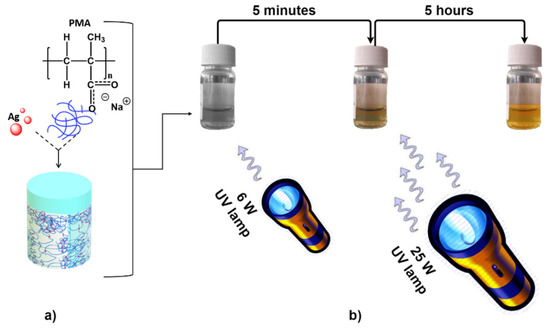 A high purity (98%) silver nitrate (AgNO3) powder was dissolved into a 30% water solution of PMA (Poly(methacrylic acid) sodium salt, ([CH2C(CH3)(CO2Na)]n, Mw = 9500); up to 10:1 (AgNO3/PMA) molar ratio (Figure 1a). Ag NPs stabilized in PMA matrix were fabricated via reduction processes under a two-step UV irradiation to control the kinetics of NPs nucleation as well as to obtain a narrow size distribution [40,41]. In the first step, the mixture has been exposed for 1 h to a 6 W UV lamp irradiation (estimated density of 470 nW/cm2). After 5 min of exposure, the reduction in Ag+ ions by PMA leads to a change of the color of the solution from colorless to yellow (see Figure 1b). In a second step, the mixture has been exposed for 5 h to 25 W UV lamp irradiation (estimated density 378 mW/cm2). During this process, PMA aqueous solution acted as capping and reducing agent. The solution color turned to dark orange (see Figure 1b).