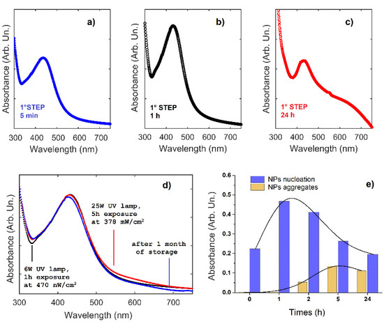 UV-vis optical absorbance spectra at different times during the first (a–c) and second (d) step of UV irradiation treatment to prepare Ag-PMA nanocolloid. The spectrum after one month by the second step of irradiation is also shown (d). The optical absorbance value vs. time is reported in panel (e) for the two main processes (NPs nucleation and aggregates).