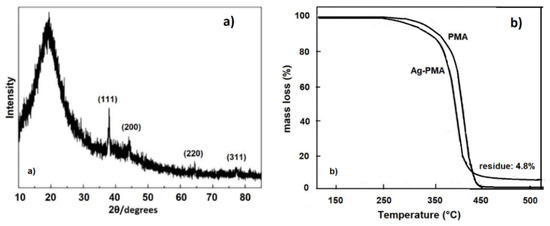 The XRD pattern of the Ag-PMA nanocolloid was also investigated (Figure 4a). The Ag crystal phase within the PMA matrix is indicated by the XRD peaks centered at 19.35°, 37.99°, 44.06°, 64.57° and 77.29°, and corresponding to the (111), (200), (220) and (311) planes of the Ag face-centered cubic (fcc) crystal structure [55]. Furthermore, the thermal stability of Ag-PMA was evaluated by thermogravimetric analysis (TGA). TG curves showed a lower thermal stability of the hybrid Ag-PMA system respect to the pure PMA system (Figure 4b). This trend is due to the homogeneous distribution of Ag NPs in the polymer matrix (see Figure 3), which induces a rapid heating effect, aiding the decomposition of the PMA matrix [35]. A percentage residual mass of 4.8% was estimated for the Ag-PMA sample, which corresponds to the amount of Ag NPs loaded into the polymer matrix. No residual mass was detected for PMA sample.