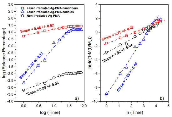 To initially check for a possible simple power-law approach and infer the character of the release mechanism, we show in Figure 6a the log-log plot of the drug release percentage versus the release time for all samples. Data show a linear correlation (and then the release kinetics can be described by a power law) over a different time, up to the saturation release percentage value. The corresponding linear fits (whose slope provides the first information about the release mechanism) are also shown. We obtain a slope of 0.88 ± 0.09 for the non-irradiated system suggesting a zero order kinetic mechanism for drug release [56,57], (2.57 ± 0.12) and (0.48 ± 0.02) for the light irradiated samples (triangle symbols for the colloids and square symbols for the nanofibers system), respectively. According to theory [56], the highest estimated slope for the irradiated colloidal systems indicates that the release mechanism is quite complex since several internal collective processes may have occurred (polymer degradation, polymer swelling and so on). On the contrary, a slope of about 0.5, as that obtained for nanofibers, indicates that the initial drug release process could be described by a diffusion process [58]. Then, in Figure 6b, we report the same data in the so-called Weibull plot form (showing the linearization of the Weibull distribution reported in Equation (1) in the double logarithmic form). All that to check if the Weibull function can be efficiently used to reproduce the whole release process for all the investigated conditions [47]. The obtained slope provides a first estimation of the Weibull exponent β, better described below. As reported in Figure 6b, we obtain a slope of 1.02 ± 0.04 for the non-irradiated samples, (2.63 ± 0.09) and (0.75 ± 0.02) for the light irradiated samples (triangle symbols for the colloids and square symbols for the nanofibers system), respectively.
