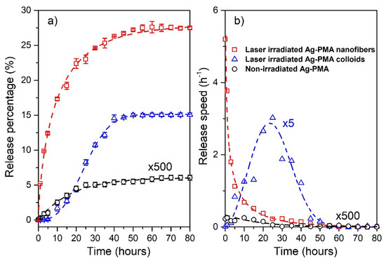 The release percentage vs. time and the corresponding best-fit performed with the use of the Weibull CDF (Equation (1)) (dashed lines) are reported in panel (a). The Weibull PDFs corresponding to the release data and fitted curves are reported in panel (b). Data for the non-irradiated system, referred to both colloids and nanofibers, are multiplied by a factor 500. The release speed data for the irradiated colloids are multiplied by a factor 5. In Figure S3 of Supplementary Materials, we include the comparison with the irradiated PMA samples that show no significant release performances.