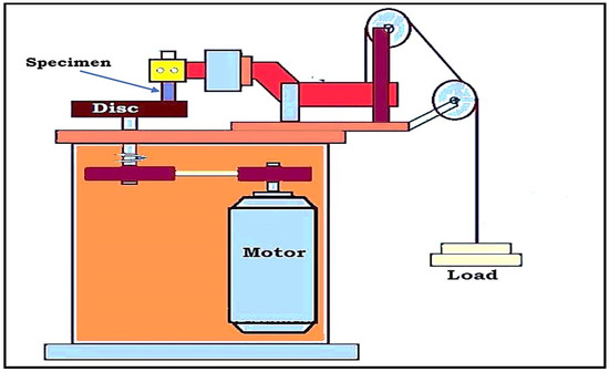 Following the completion of the wear test, a scanning electron microscope was utilized to analyze the worn surface of the graphite filled and unfilled ABS parts. (Scanning Electron Microscope: TESCAN-VEGA3 LMU, Tungsten Heated Cathode, Probe Current: 1 pA to 2 μA). The gold coating was applied to the specimens that were evaluated in order to make them electrically conductive and so improve the resolution of the SEM observation. Figure 2 depicts the schematic diagram of friction and wear test machine, while Figure 3a,b depicts the photograph of the wear test specimens produced using fused deposition modeling. Confocal microscopy (CM) studies were performed using Olympus LEXT 4000 microscope to examine worn out surface morphology.