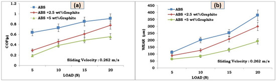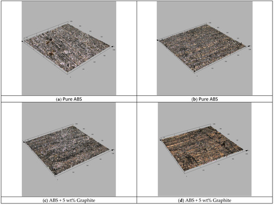 Sliding wear tests were used to study the effects of graphite on the wear and friction performance of ABS–graphite composites. Figure 4a,b and Figure 5a,b indicate the influence of graphite incorporation on the friction coefficient and wear behavior of 3d printed ABS parts, respectively. It is discovered that by incorporating graphite particles into the ABS matrix, the wear loss and friction coefficient are greatly reduced. For a given load value of 10 N and sliding velocity of 1 m/s, the average coefficient of friction of the ABS-5 wt% graphite and ABS-2.5 wt% graphite specimens is reduced by 44 and 31 percent, respectively. In the instance of wear loss, graphite-filled FDM specimens showed a 27% and a 55% reduction in wear loss under the same load and sliding velocity. It implies that the lubricant particle has a substantial impact on the wear behavior and friction of FDM composites. The use of graphite particles dramatically reduced the FDM composite friction coefficient. Most significantly, the friction coefficient of the graphite-filled ABS composites was lower (0.22) than that of the unfilled ABS sections (0.65) [16]. The figures show that adding graphite to FDM composites significantly enhances their tribological properties. Graphite owns a layer structure, with atoms in each layer grouped in a hexagonal unit cell. These layers are linked by weak van der Waals connections, which are easily destroyed by shear forces under sliding conditions [17].