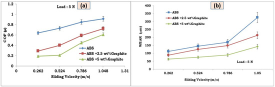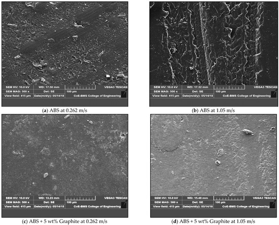 Figure 5a,b depict the COF and wear loss variations of ABS filled graphite and ABS in terms of sliding velocity, respectively. The graph shows that the COF decreases as the sliding velocity increases for all of the compositions studied. Graphite filled FDM parts, on the other hand, show a considerable reduction in COF values when compared to pure ABS at all sliding speeds examined. As previously stated, an increase in COF with increased sliding velocity could be related to changes in the wear mechanism at higher sliding velocities. As the sliding velocity increases, the interfacial temperature between the test specimen and the steel disc rises, resulting in softening of the test specimen and excessive plastic deformation. At greater sliding velocities, this change in surface shape affects frictional values as well as wear behavior. Furthermore, in the case of graphite filled FDM parts, the greater thermal conductivity and good lubricating qualities of graphite particles limit interfacial temperature as well as the wear mechanism at the interface between test specimen and steel disc.
