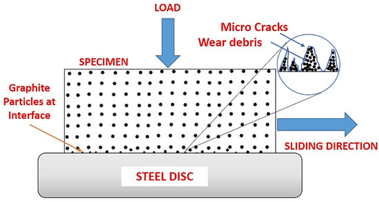 Many exposes and defects were seen on the worn surfaces, resulting in significant wear for unfilled composite. The wear of graphite filled composites is less severe than that of unfilled composites. Due to the increased load-carrying capacity offered by graphite particles, the worn surface has a layered structure with fissures. The wear damage on the worn surface of graphite filled composites was found to be the mildest, with almost no matrix separation and few cracks. The presence of graphite particles is thought to be responsible for the filled composite’s improved tribological characteristics. Figure 8 depicts the wear model of a graphite-filled composite. At one end, a favorable rolling action induced by microscopic particles reduces the coefficient of friction; at the same time, tiny wear debris is generated, which can fill in gaps and holes, resulting in a smooth worn surface. On the other hand, the improved load carrying capacity supplied by graphite particles significantly reduced extreme abrasive wear during the sliding process, resulting in better mechanical characteristics of the composite components when paired with groove-filling debris.