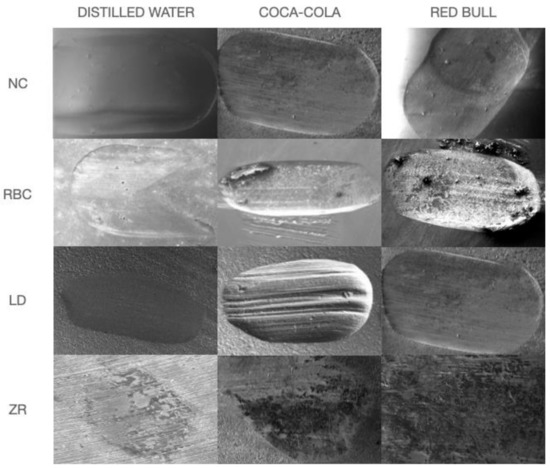 The mean volumetric wear (±SD, expressed in mm3) is summarized in Table 2. Two-way ANOVA reported a significant influence of the factor “material” (p = 0.00001) and of the factor “acidic beverage” (p = 0.0014) but not for their interaction (p = 0.52). Tukey’s post hoc test showed that RBC and NC suffered greater volumetric wear than LD and ZR, showing a statistical significance between them. Regarding acidic beverages, distilled water induced less volumetric wear than the other tested solutions.