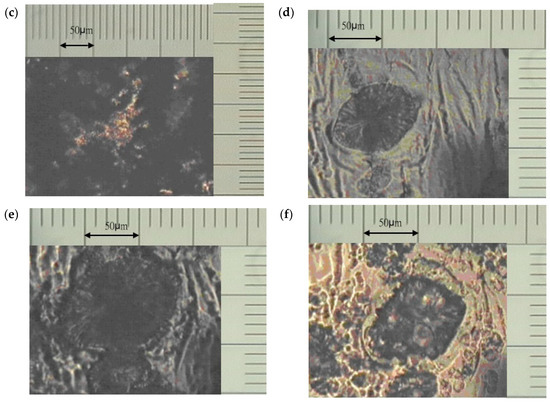 Polarized optical microscope (POM) image of (a) BP/B10 (2:1) 150 °C/1 h, 200×. (b) BP/B10 (2:1) 150 °C/5 h, 200×. (c) BP/B10 (2:1) 150 °C/5 h, ramp 10 °C/min to 210 °C, 200×. (d) BP/B10 (2:1) 160 °C/1 h, 500×. (e) BP/B10 (2:1) 160 °C/5 h, 500×. (f) BP/B10 (2:1) 160 °C/5 h, ramp 10 °C/min to 210 °C, 500×.