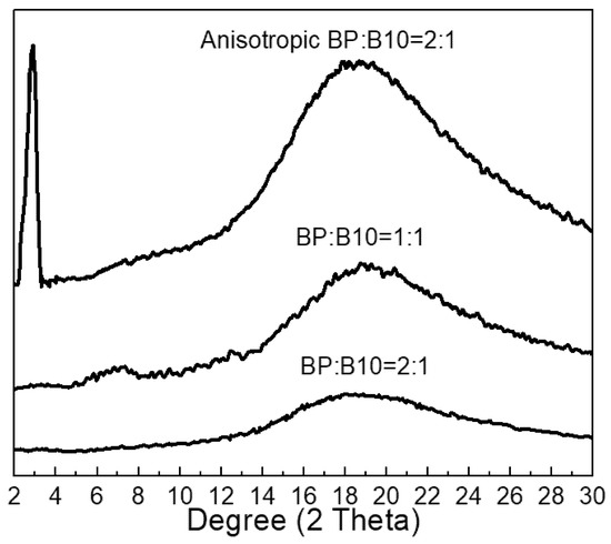 By using DSC and polarized microscopy, we observed a smectic LC phase in the range of 128–153 °C for BP epoxy [20]. The anisotropic BP/B10 (2:1) sample exhibited partially opaque features, and BP/B10 (1:1) showed much less opaque but not clear features. The BP/B10 (2:1) showed less clear features. The opaque features indicated that there was a crystalline structure in the anisotropic BP/B10 (2:1). The X-ray analysis was used to examine the crystalline phase of the BP/B10 system. Anisotropic BP/B10 (2:1) had a crystalline structure, as shown in Figure 3. The sharp diffraction peak at 2θ = 3°, and d spacing is equal to 29.4 Å. Another broad diffraction peak at 2θ = 16–24°, and d spacing is equal to 4–5 Å. Our previous work [20] demonstrated that smectic structure is preserved in the BP/SAA system, with the same broad peak in the XRD, which indicated that anisotropic BP/B10 (2:1) had smectic phase. The X-ray diffraction peak indicating smectic LC phase can also be observed in the literature [47]. The highly ordered structure of the anisotropic BP/B10 (2:1) system may be responsible for the good thermal stability and lowest CTE value of all samples.