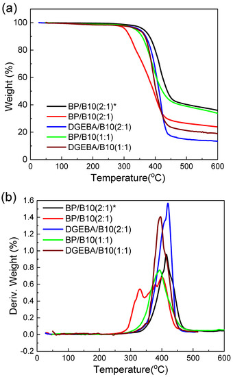 As seen from Table 1 and Figure 4a, the temperature of 5% weight loss of anisotropic BP/B10 (2:1) was the highest, and the amount of decomposition residue was also the highest. This is because of the LC structure in the anisotropic sample and the enhanced thermal stability. The sample of BP/B10 (2:1) had the lowest temperature of 5% weight loss. Although the 5% weight loss temperature of DGEBA/B10 (2:1) was higher than that of BP/B10 (2:1), the amount of decomposition residue was the lowest at 450 and 500 °C. This is due to the flexible structure of DGEBA, which can easily crosslink and formed a denser network than the normal BP sample after curing, and it displayed high thermal stability at the beginning of high temperatures, but it decomposed fast and retained fewer residues after reaching a higher temperature because it does not have a rigid-rod structure. Those phenomena agree with our previous research [45]. The temperature of 5% weight loss of anisotropic BP/B10 (2:1) was 15 °C higher than the anisotropic BP/DDS (1:1) system [46], although anisotropic BP/DDS (1:1) had a higher curing temperature and formed LC phase much easier. This may be because BP/B10 (2:1) was cured at LC temperature for a long time to fix the LC phase, and was thus not easy to crack. The amount of decomposition residue in BP/B10 (1:1) was higher than that of DGEBA/B10 (1:1). This BP had more rigid-rod molecules than DGEBA. The fastest decomposition rate of DGEBA/B10 (1:1) was the largest due to a lack of rigid-rod chains.