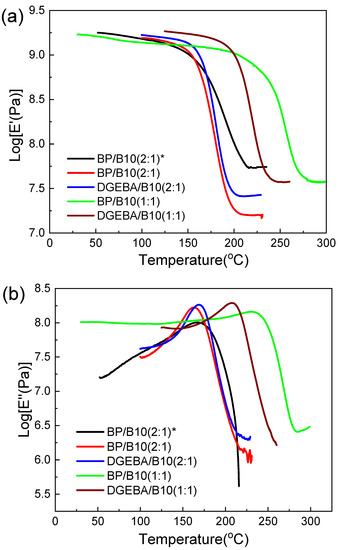 The lower β relaxation temperature of DGEBA/B10 means that only lower energy was required to move its short segments because of the softer structure of DGEBA. The β relaxation temperatures of the anisotropic BP/B10 (2:1) and BP/B10 (2:1) were slightly higher, which means that higher energy was required to move their short segments. This is because the BP structure was harder. The α relaxation of the BP/B10 and DGEBA/B10 systems was very large, which may be due to trapping of the main chain of small molecules that moved first.