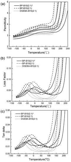 From Table 8 and Table 9, and Figure 8a–c, it is seen that BP/B10 (1:1) had a lower dielectric constant and loss coefficient than DGEBA/B10 (1:1). This is because the ratio of 1:1 provided enough curing agent, BP/B10 was easy to form a network structure and its dipole moment was not easy to move after formation, so the dielectric properties were better than DGEAB/B10. The anisotropic BP/B10 (2:1) and BP/B10 (1:1) showed better dielectric constant and dielectric loss than the report of DGEBA/B10 (1:1) [31]. BP/B10 (1:1) also had better dielectric properties than TMBP/B10 (2:1) and TMBP/B10 (1:1) [18], as well as DGEBA/B10 [52,55].