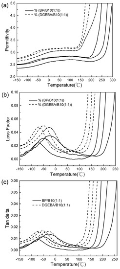 As seen from Table 5, Table 6 and Table 7, and Figure 7a–c, the dielectric constant of anisotropic BP/B10 (2:1) was lower than that of BP/B10 (2:1), but it was higher than that of DGEBA/B10 (2:1), and the loss factor was the same. This is because the ratio of 2:1 leads to less curing agent. The BP system was more difficult to crosslink and had more linear chains, while the DGEBA system had a softer molecular chain, although there was less curing agent. However, it was easy to move and crosslink, and the degree of crosslinking was higher, so it had better dielectric properties than the BP system.