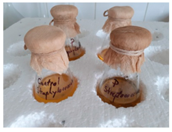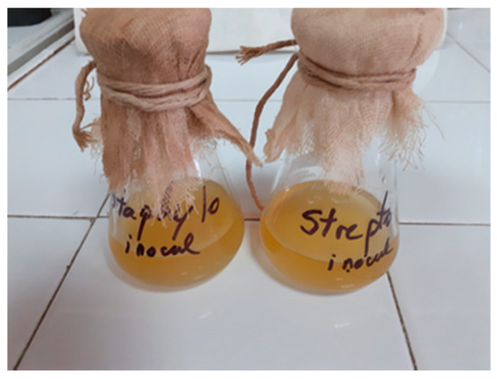 Obtaining the bacterial inoculum is completed by the seeding of a colonial fragment from each bacterial species in liquid culture medium (Eugon Broth—LAB 526) distributed in sterile Erlenmeyer flasks, shown in Figure 3. This culture medium had the same composition as above, except the gelling agent (agar). After sowing, the bacteria were left to grow for 18–20 h under aerated and stirred conditions at 37 °C.