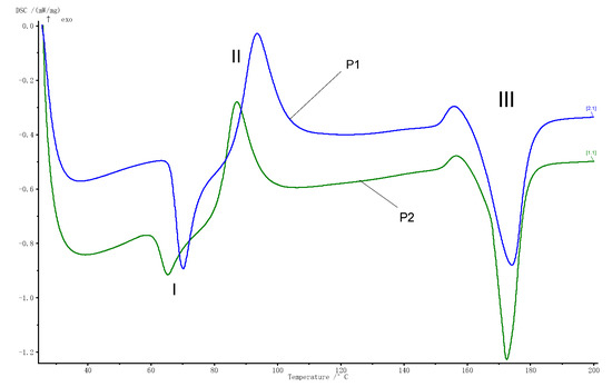 Highlighting the thermal behaviors of the tested samples: I, the first transformation; II, the second transformation; III, the third transformation; P1 (blue) and P2 (green) curves.
