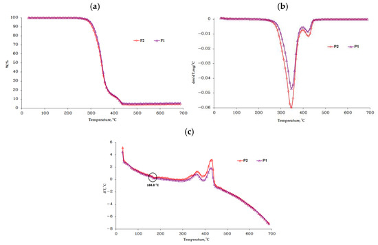 Overall, for the two analyzed samples, the thermal decomposition took place in two stages, with a higher percentage of mass loss in the first stage, in the (291–371 °C) temperature range. The main thermogravimetric characteristics, shown in Table 2, and the thermogravimetric curves (a), (b) and (c) in Figure 7 indicate that no significant changes occurred in samples P1 versus P2. There are only a few degrees of decrease in the onset temperature of the thermal decomposition for the injected sample. Slight variations also occurred for the amount of residue obtained at a temperature of 700 °C. In the case of the P2 sample, the amount of residue decreases by 1.27 percent, compared to P1. This difference can be attributed to the slight reduction in the thermal stability of the injected samples against the granules.
