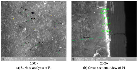 The surface analysis of P1, shown in Figure 8a, reveals a uniform layer deposition. Inside the coating are visible micro-cracks (noted with MC), micro-pores characteristic of PVD deposition process noted with MP and unmelted AgNPs (symbolized with a yellow arrow). The formed coating contains melted AgNPs.