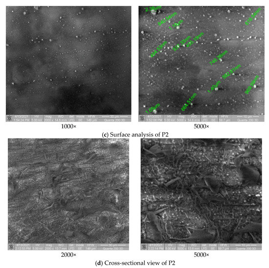 SEM analysis of the samples. (a) Surface analysis of P1; (b) Cross-sectional view of P1; (c) Surface analysis of P2; (d) Cross-sectional view of P2.