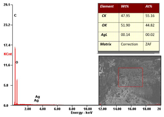 According to the obtained results from this analysis, shown in Figure 9, carbon and oxygen (in atomic and mass percentages) were distinguished as dominant constituents and were found in approximately equal proportions, C: 47.95%, O: 51.9%. Their presence in such a large quantity confirms the high degree of biodegradation, as they contain chemical elements that are found in abundance in the chemical structure of plants under different types of oxygen-carbon bonds (specific for cellulose, hemicellulose, lignin, lignin derivatives, etc. [26]). Furthermore, in the composition of the material, a very small amount, 0.14%, of silver (Ag) is found, which comes from the coating of biopolymeric granules with silver nanoparticles.