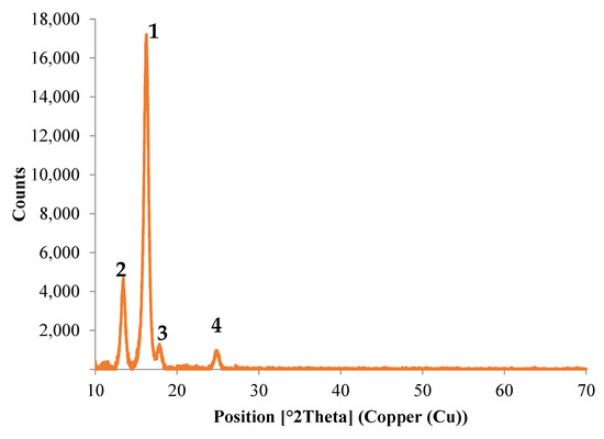 - The fourth peak is at an angle of 24.80° with a diffraction intensity of only 973.17, which corresponds to the area of cellulose crystallization. Similar results have been obtained by the authors of the papers in [41,42].