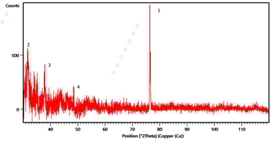 To identify the silver element in the sample injected with the composite material, a structural analysis was performed, at which the value of the 2θ angle was measured only for values above 30°, as according to the literature, no crystallizations of silver are visible under this angle. Figure 11 shows the structural analysis of the injected sample from granules coated with AgNPs, in which several peaks can be identified, and, according to the literature, correspond to the silver crystallization area. The predominant peak was recorded at an angle of 76.71° (marked with 1), followed in intensity by the peak at 31.42° (marked with 2), then the one at 37.81° (marked with 3) and finally the peak at 43.95° (marked with 4) [27,43,44,45]. The presence of these peaks that are specific to the silver crystallization certifies its incorporation in the biopolymeric structure.