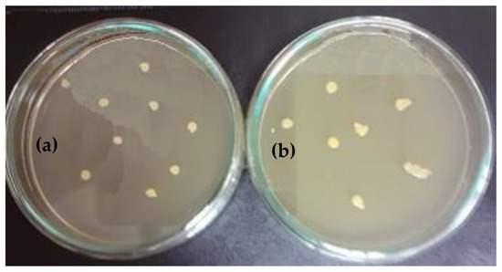 - In total, 5 sterile Petri plates were prepared, in which approximately (20–25) mL of agarized culture medium was poured. After solidification, the surface of the medium was inoculated with 0.1 mL of cell dilution suspension from 10−5 to 10−1. The suspension was uniformized on the surface of the culture medium by means of a sterile bacteriological loop, and then it was incubated for 24–48 h (as appropriate) for cell development and colony formation.