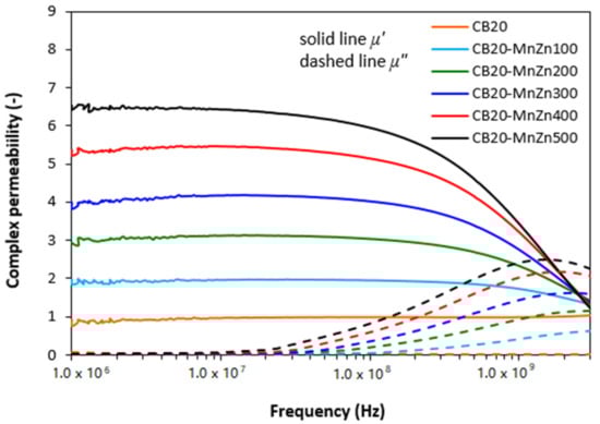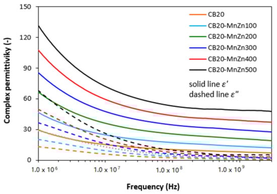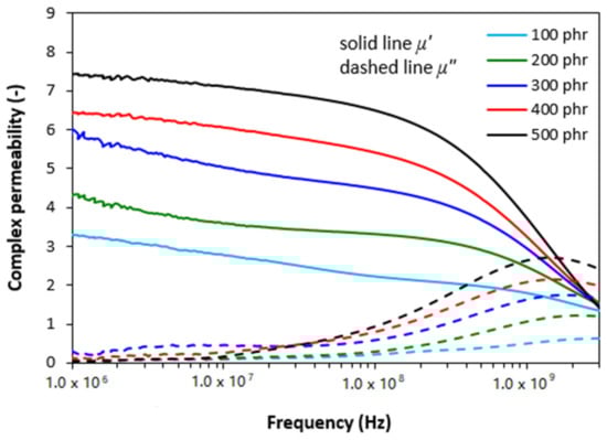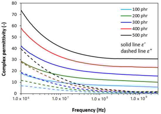 From frequency responses of complex permittivity of ferrite filled composites (Figure 2) it becomes obvious that the real part ε′ first decreased with increase in frequency up to roughly 10 MHz. Then, it stabilized at constant values. The initial decrease of ε′ can be attributed to the semiconducting nature of magnetic soft manganese-zinc ferrite. As also seen in Figure 2, the higher was the amount of magnetic filler in composites, the higher was the real permittivity. When the content of ferrite in composites increased from 100 to 500 phr, the real part increased from 18 to 74 at 1 MHz. With increasing frequency of EMI, the differences in real permittivity became less visible. The imaginary permittivity ε″ of composites showed the similar frequency dependences. Upon initial decline at low frequencies, the differences in ε″ were negligible over 1 GHz. The obtained changes in frequency dependencies of complex permittivity can be attributed to various polarization mechanisms, which are generated in ferrite as well as rubber matrix due to their dielectric nature (mostly polarization caused by space charges that accumulate at phase interfaces between the filler and the rubber matrix).