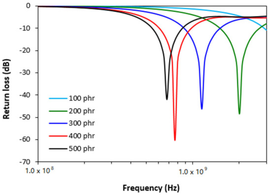 Figure 3 depicts the return loss of ferrite filled composites in the examined frequency range. It becomes apparent that all composites containing 200–500 phr of manganese-zinc ferrite exhibit suitable absorption shielding performance. As also shown, with increasing content of ferrite, the absorption shielding effectiveness and absorption maxima of composites shift to lower frequencies of EMI. As the best absorption composite shield can be considered the material filled with 200 phr of magnetic filler as it demonstrated return loss at −10 and −20 dB in the widest frequency range, i.e., from 1.5 to 2.7 GHz at −10 dB and from 1.85 GHz to 2.2 GHz at −20 dB. The absorption maximum of this shield was found to be at −48 dB at the frequency 2 GHz of the incident EMI. The composite containing 400 phr of ferrite filler showed lower absorption maximum (−60 dB), but also a lower frequency range with effective absorption of EMI (RL at −10 dB within 0.6–0.98 GHz frequency range and RL at −20 dB within only 0.72–0.83 GHz frequency range). The maximally filled composite demonstrated the lowest effective absorption bandwidth and the highest absorption maximum. The electromagnetic absorption characteristics (bandwidth Δf for RL at −10 and at −20 dB, minimum value of return loss RLmin at a matching frequency fm and matching frequency fm) are summarized in Table 2. It can be stated based upon the obtained results that ferrite filled rubber composites can be used as efficient EMI shields at frequencies above 0.5 GHz.