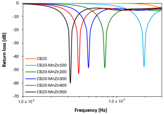 Frequency dependences of return loss for hybrid CB/ferrite filled composites.