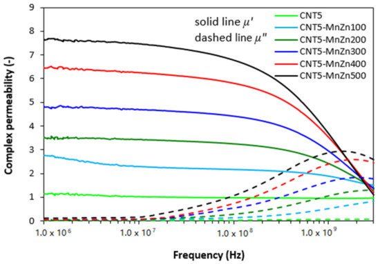 The results obtained from determination of complex permeability (Figure 7) revealed that the lowest values of real and imaginary permeability exhibited the composite filled only with CNT, with almost no dependence of both parts on radiation frequency. The increasing degree of ferrite loading resulted in the increase of real permeability mainly at low frequencies and imaginary part at higher frequencies. When comparing the frequency dependences of complex permeability for composites filled only with magnetic filler (Figure 1) and hybrid composites filled with ferrite and carbon-based fillers (Figure 4 and Figure 7), it becomes apparent that the differences are very small and generally it can be stated that no significant changes in complex permeability of composites can be observed in dependence on the filler’s composition.