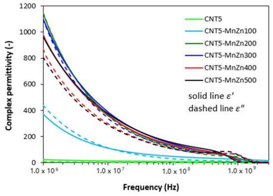 As shown in Figure 8, the real ε′ and imaginary ε″ parts of complex permittivity for hybrid CNT/ferrite composites showed significant decreasing trend with increase in radiation frequency. In comparison with the composite filled only with 5 phr of CNT, the application of 100 phr ferrite resulted in the increase of ε′ from 23 up to 371 at 1 MHz. The increasing loading of ferrite in hybrid composites led to the increase of real permittivity up to 200 phr at 1 MHz (ε′ = 1147 for the composite filled with 200 phr of ferrite and 5 phr of CNT). Subsequently, the real permittivity slightly decreased with next increasing content of magnetic filler at 1 MHz (ε′ = 966 for the composite filled 500 phr of ferrite and 5 phr of CNT). Then, the increase in frequency from 1 MHz to 3 GHz caused the decrease of the real permittivity to very low values. As seen, the real permittivity of composites decreased to 17 or 0.1, respectively, by increasing content of magnetic filler from 100 phr up to maximum content at 3 GHz. The similar tendency can be also observed in frequency dependencies of imaginary part. It becomes also obvious from Figure 8 that the values of imaginary permittivity are very similar with real part ε′ of equivalent composites in the whole tested frequency range. The incorporation of 100 phr magnetic filler resulted in the increase of imaginary permittivity in more than 430 at 1 MHz (from about 9 for the composite filled with 5 phr of CNT up to 439 for the composite filled with 5 phr of CNT and 100 phr of magnetic filler). The imaginary permittivity of the composite filled with 100 phr of ferrite dropped down to roughly 7 by increasing of frequency up to 3 GHz. The imaginary part of the maximally filled composite declined from 807 at 1 MHz to 1.5 at 3 GHz. When comparing the complex permittivity of composites filled only with manganese-zinc ferrite (Figure 2), hybrid CB/ferrite filled composites (Figure 5) and hybrid CNT/ferrite filled composites (Figure 8) it becomes apparent that both, the real and imaginary permittivity increase in the following order: ferrite composites < CB/ferrite composites < CNT/ferrite composites.