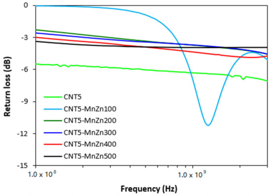 From graphical illustrations of frequency dependences of return loss for hybrid CNT/ferrite composites (Figure 9) it is shown that the composite filled only with carbon nanotubes and hybrid composites containing 5 phr of CNT and 200–500 phr of ferrite do not provide any absorption shielding performance, because they did not reach return loss at least at −10 dB. Only the composite filled with 5 phr of CNT and 100 phr of ferrite was found to have a slight absorption shielding ability. Although, the effective absorption frequency bandwidth of this composite at −10 dB was narrow and ranged only from 1.14 to 1.39 GHz. The absorption maximum was at −11.2 dB at frequency 1.24 GHz of EMI.