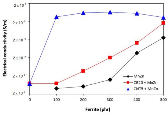 The electrical conductivity of composites filled only with ferrite and hybrid composites is depicted in Figure 10. As shown, the lowest electrical conductivity exhibited composites filled only with manganese-zinc ferrite. It also becomes obvious that the increasing content of ferrite resulted in the increase of electrical conductivity of composites despite the fact that ferrite ranks among dielectric materials. Composites filled with combination of ferrite and carbon-based fillers exhibited higher electrical conductivity compared to equivalent composites filled only with ferrite. As also seen in Figure 10, the electrical conductivity of composites filled only with 20 phr of carbon black or 5 phr of carbon nanotubes was almost the same. The incorporation of 100 phr magnetic filler resulted in a significant increase of electrical conductivity of hybrid CNT/ferrite composites. Based upon the achieved results it might be stated that by combination of carbon nanotubes and magnetic filler, the percolation threshold and formation of conductive filler paths are reached even at low magnetic filler content resulting in outstanding increase of electrical conductivity. When comparing graphical illustrations of permittivity of composites filled only with ferrite (Figure 2), hybrid CB/ferrite composites (Figure 5) and CNT/ferrite composites (Figure 8) and their electrical conductivity, one can see, that the higher is electrical conductivity, the higher is the imaginary permittivity and consequently, the higher is complex permittivity of composites, mainly at low frequencies. On the other hand, looking at the mutual relation between imaginary permittivity and radiation frequency, it becomes apparent that the increasing frequency of electromagnetic radiation causes the decrease in imaginary permittivity, as was also confirmed during experimental measurements.