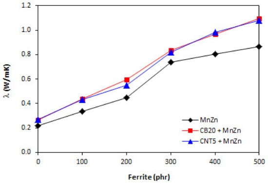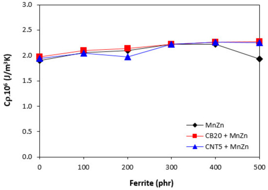 Polymers in generally have low thermal conductivity. As the thermal conductivity of ferrites and carbon-based fillers is much higher, their incorporation into rubber matrix should lead to the increased thermal flow through composite systems. Thermal conductivity refers to heat built up and heat transfer trough the material. The higher thermal flow can result to faster heating of rubber compounds, consequently to faster vulcanization. On the other hand, during mechanical and dynamic strain and accumulation of energy, the generated heat can be more easily lead away from the material. The results obtained from determination of thermal conductivity coefficient λ confirmed the presumption as shown in Figure 11, seeing that the higher was the amount of magnetic filler, the higher was the thermal flow through the composites. It can also be stated that the thermal conductivity coefficient of the composites filled only with 20 phr of CB or 5 phr of CNT was almost the same. The incorporation of ferrite resulted in further increase of coefficient λ with the similar values for both types of hybrid composites. By contrast, the volumetric heat capacity Cρ of composites was almost independent on the content of ferrite or combination of fillers and its values fluctuated only in the low experimental range (Figure 12).