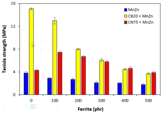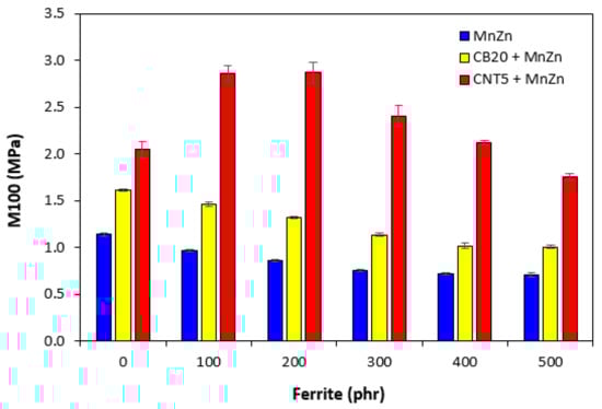 The mechanical properties of composites filled only with ferrite and hybrid composites are graphically illustrated in Figure 13, Figure 14 and Figure 15. As shown in Figure 13, the elongation at break of ferrite filled composites showed slight increasing tendency with increasing content of magnetic filler. On the other hand, upon initial increase of the property of hybrid CB/ferrite composites at 100 phr of ferrite, the elongation at break of those composites showed decreasing trend with next increase in ferrite content. The lowest elongation at break exhibited hybrid CNT/ferrite composites. It is also possible to observe that elongation at break composites filled with combination of ferrite and carbon nanotubes passed over a maximum at 300 phr of ferrite. Then, a decreasing trend was observed. The elongation at break of the maximally filled CNT/ferrite composite was still more than 150% higher when compared to the composite filled only with 5 phr of CNT. It also becomes very interesting that while the elongation at break of the composite filled with 20 phr of CB was almost two times higher in comparison with that of the composite filled with 5 phr of CNT, the elongation at break of the maximally filled CNT/ferrite and CB/ferrite composites was established almost on the same value. From Figure 14, it becomes apparent that the lowest modulus M100 were found to have composites filled only with ferrite. The increasing amount of magnetic filler in composites resulted in a slight decrease of M100. The increasing content of ferrite caused also the decrease in M100 of hybrid CB/ferrite composites, although the modulus of hybrid CB/ferrite composites was higher when compared to the equivalent ferrite filled composites. The highest M100 were found to have hybrid CNT/ferrite composites. When compared to the composite filled only with 5 phr of CNT, the incorporation of 100 and 200 phr ferrite resulted in the increase in M100 of CNT/ferrite composites. Then, the modulus showed decreasing tendency with next increasing content of ferrite. Similarly, the lowest tensile strength exhibited composites filled only with magnetic filler (Figure 15). In addition, the higher the amount of magnetic filler in composites, the lower was the tensile strength. The application of CB and CNT resulted in the increase of tensile strength. The biggest difference in tensile strength among all types of composites was recorded for the reference samples and composites with lower ferrite content. As seen in Figure 15, the highest tensile strength demonstrated the composite filled with 20 phr of CB and the composite filled with combination of carbon black and 100 phr of ferrite. The tensile strength of the hybrid CNT/ferrite composite with 100 phr of ferrite first increased in almost 3 MPa when compared to the reference CNT filled composite (from 4.3 MPa for the composite filled with 5 phr of CNT to nearly 7.5 MPa for the composite filled with carbon nanotubes and 100 phr of ferrite). Then, the tensile strength of hybrid CNT/ferrite composites was found to decrease with next increasing content of magnetic filler. The initial enhancement of tensile strength for hybrid CNT/ferrite composites can be ascribed to some synergistic effect of both, carbon nanotubes and ferrite. It also becomes obvious that the higher the content of ferrite in all types of composites, the lower was the difference in tensile strength, but the tensile strength of composites filled with combination of carbon-based fillers and ferrite was higher in all ferrite concentration scale when compared to the corresponding composites filled only with manganese-zinc filler.