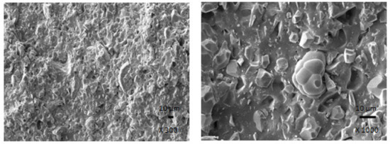 The results clearly demonstrated that ferrite acts as inactive filler when incorporated in the rubber matrix. The reason can be attributed to the poor compatibility and adhesion between ferrite and rubber on the filler-rubber interface, as was also confirmed from SEM analysis of composites (Figure 16). In addition to various voids and inhomogeneities existing on the interface filler-rubber, it is also agglomeration of ferrite particles, which contributed to the worsening of adhesion between both components. On the other hand, the introduction of carbon-based fillers resulted in the improvement of mechanical characteristics of hybrid composites. Both fillers exhibit strong reinforcing effect when they are incorporated into rubber matrices. Moreover, the dispersion of fillers, mainly ferrite in hybrid CB/ferrite composites (Figure 17) as well as CNT/ferrite composites (Figure 18) was higher, which can be attributed to higher viscosity of the rubber compounds owing to the presence of carbon-based fillers. Thus, higher shear stress was generated during fabrication and compounding of composites, which facilitated distribution and dispersion of ferrite inside the rubber matrix. It also becomes apparent from SEM images that both carbon-based fillers contributed to the improved adhesion and mutual compatibility between ferrite and the rubber matrix.