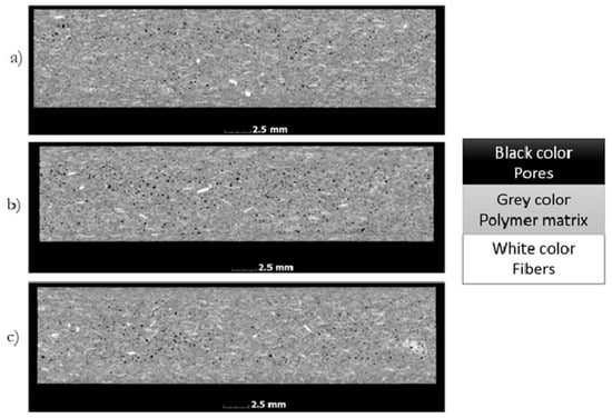 Computed tomography studies allow for spatial geometry to analyze physical objects, where the gray scale recorded for the object is proportional to its density (Figure 2). The polymer matrix of samples has a slightly different density than fibers. The difference recorded in the shades of gray allows for the threshold value to be set and, on this basis, to separate the gray scale for fibers and matrix. As a result of such thresholding, fiber geometry is obtained, which can then be analyzed, e.g., by determining the sphere describing the geometry obtained. Figure 2 also shows actual sample images (for a 50 µm voxel size) after computed tomography. Black objects indicate pores, white objects indicate fibers, and gray objects indicate the polymer matrix. Due to the small differences in the matrix and fiber density, a small number of fibers embedded in the polymer matrix are noticeable. In order to obtain more accurate results, the images were digitally reconstructed, where the results are shown in Figure 3 and Figure 4.