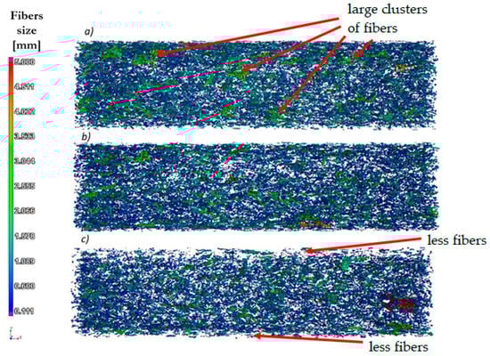 Statistical analysis was performed on the relationship between the volume of fiber aggregates and their length (Figure 5). It was noted that for the composite injected at the highest rate, the fiber clusters have the smallest dimensions. In addition, using the software, the mass fraction of fibers was determined to be 12%, where the real mass fraction of fibers in the prepared biocomposite was 15%. It is believed that this is due to the structure of natural fibers, including the different density of their individual components.