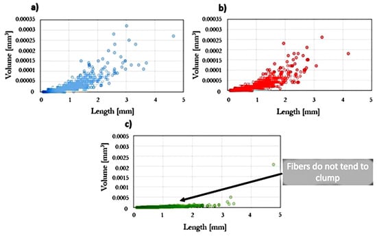 The volume of fibers and their clusters as a function of their length for injected samples at variable injection rate: (a) 10, (b) 35, and (c) 70 cm3/s.