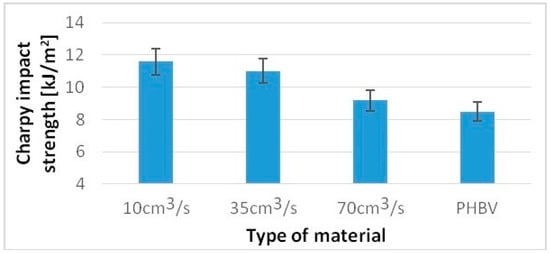 The Charpy impact strength of tested samples produced at a variable injection rate compared to a pure PHBV sample produced at 35 cm3/s.