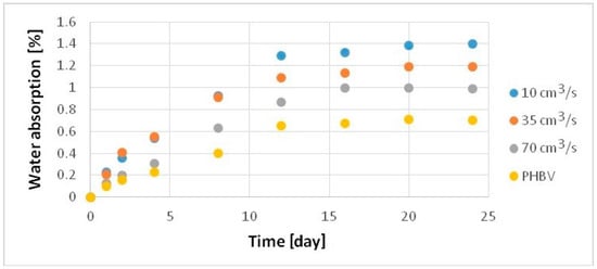 The water absorption of the samples produced was studied following the standard PN-EN ISO 62 [29]. Analyzing the results (Figure 9), a significant increase in water absorption was observed for samples of the composites filled with hemp fibers. From the first days of the measurement, a moderate increase in water absorption is noticeable (relative to the sample from pure PHBV) for the sample made with an injection rate of 70 cm3/s and a significant increase for the samples manufactured with injection speeds of 30 and 10 cm3/s. After 24 days of testing, water absorption of the biocomposite sample manufactured at injection rate of 70 cm3/s rose by 41% relative to the pure PHBV sample, 69% for the sample manufactured at a speed of 35 cm3/s, and over 100% for the sample injected at a speed of 10 cm3/s.