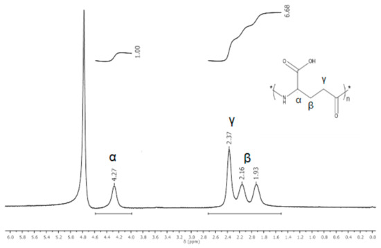 Prior to using γ-PGA to prepare the nanofiber mats, this polymer was characterized by 1H NMR spectroscopy to confirm its purity. The 1H NMR spectrum showed peaks that corresponded to γ-PGA (Figure 1); the α-CH proton appeared at 4.2 ppm and the β-CH2 group had two signals at 2.16 and 1.9 ppm with the γ-CH2 at 2.37 ppm [28].