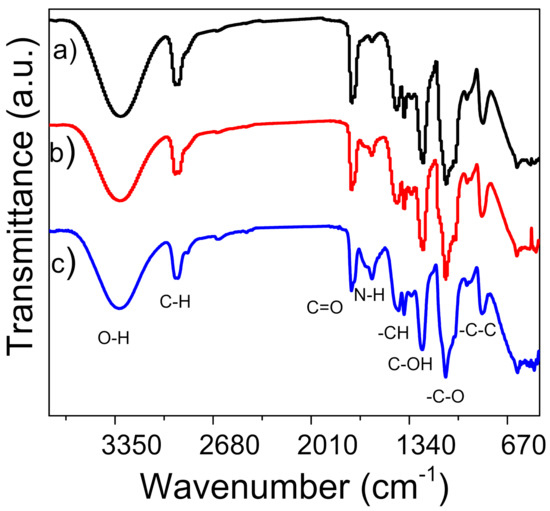 FT-IR spectra of nanofibers (a) PVA, (b) PVA/γ-PGA 5 and (c) PVA/γ-PGA 10.