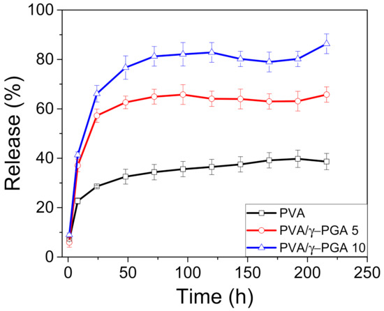 The release profiles of chlorogenic Acid from PVA, PVA/γ-PGA 5, and PVA/γ-PGA 10.