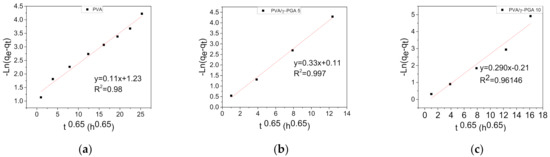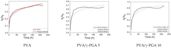 Peppas Model for PVA, PVA/γ-PGA 5, PVA/γ-PGA 10, and Weibull model for PVA/γ-PGA 5, and PVA/γ-PGA 10.