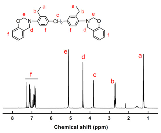 Furthermore, proton nuclear magnetic resonance (1H-NMR) experiments were carried out to characterize the chemical structure of MOEA-BOZ. As shown in Figure 1, resonances at 1.2 ppm (a), 2.7 ppm (b), and 3.7 ppm (c) came from the original -CH3, -CH2- (adjacent to the methyl group) and methylene bridge (between two phenyl groups) of reactant MOEA. Multiple resonances at 6.77–7.34 ppm correspond to the hydrogens on the phenyl rings (f). While resonances at 4.2 ppm (d) and 5.1 ppm (e) were attributed to methylene of N-CH2-Ar and N-CH2-O in the newly formed oxazine rings, respectively. The integral areas of the resonance peaks at 4.2 and 5.1 ppm were nearly the same, indicating the stoichiometric cyclization reaction of intermediate product B with formaldehyde. The as formed MOEA-BOZ monomer had a high purity (≈99%).