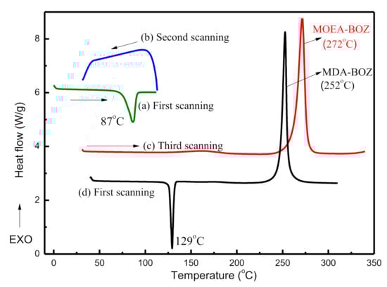 DSC curves of MOEA-BOZ (a–c) and MDA-BOZ (d) monomers.