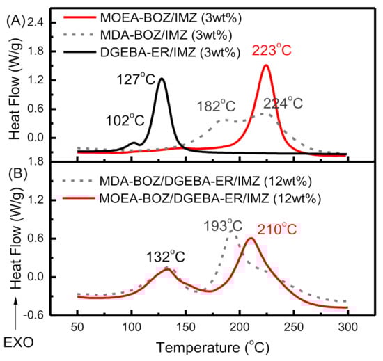 3.3. Curing Reaction of MOEA-BOZ/DGEBA-ER/IMZ Blending Systems